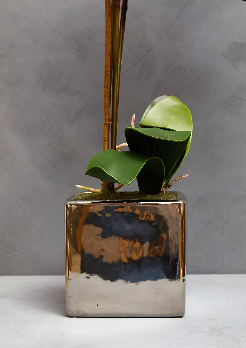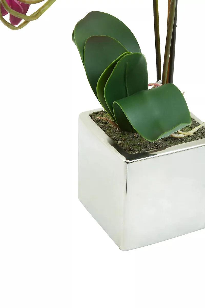 With a mixture of purple orchids, stems and lush green succulents, this plant settles in a ceramic square planter in a silver finish. Ideal to make a centrepiece, the vibrant blooms and verdant moss will look realistic in a botanical arrangement.